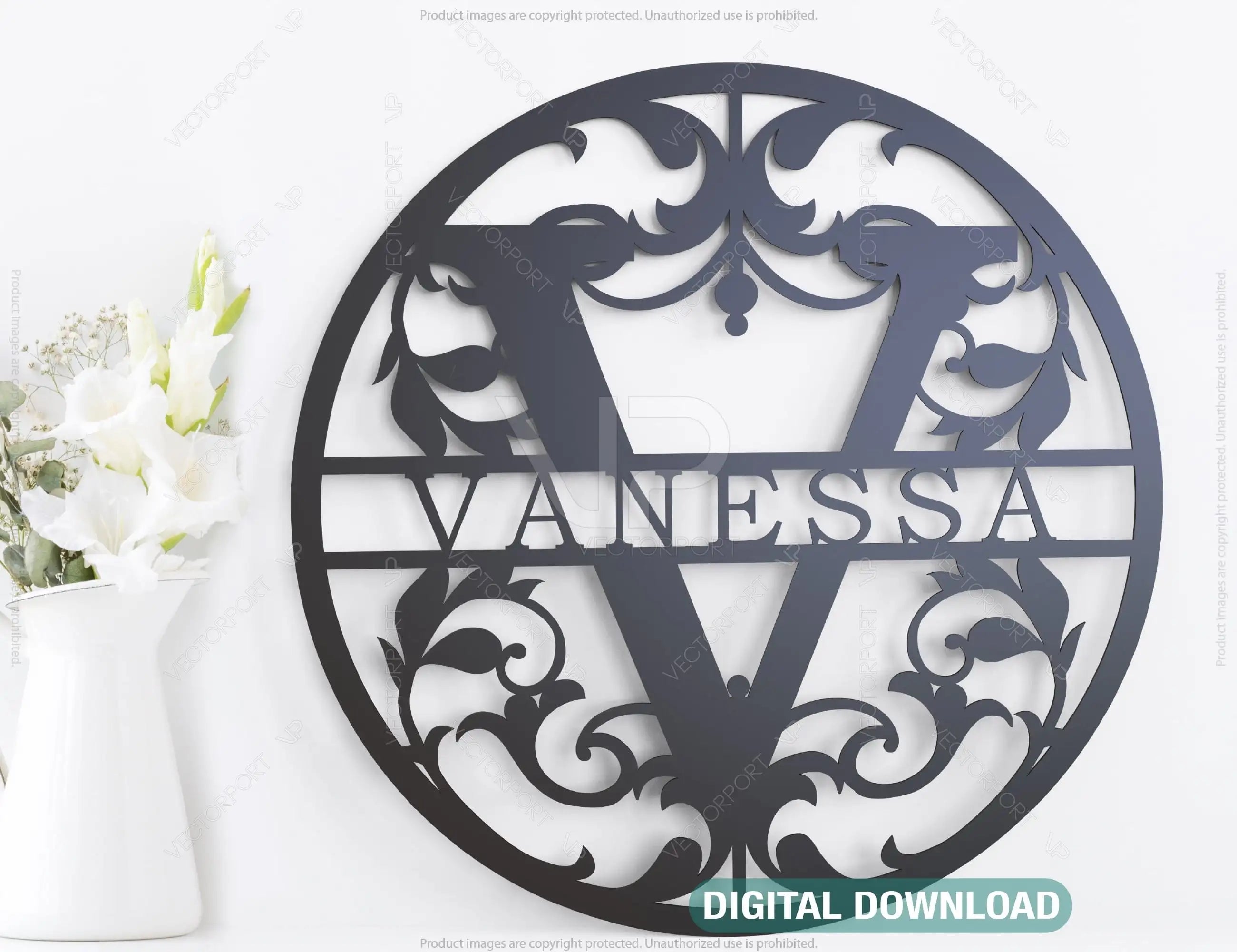 Floral Round Personalized Split Regal Monogram Alphabet Letters Laser Cut Name Sign Customizable Template |#U056|