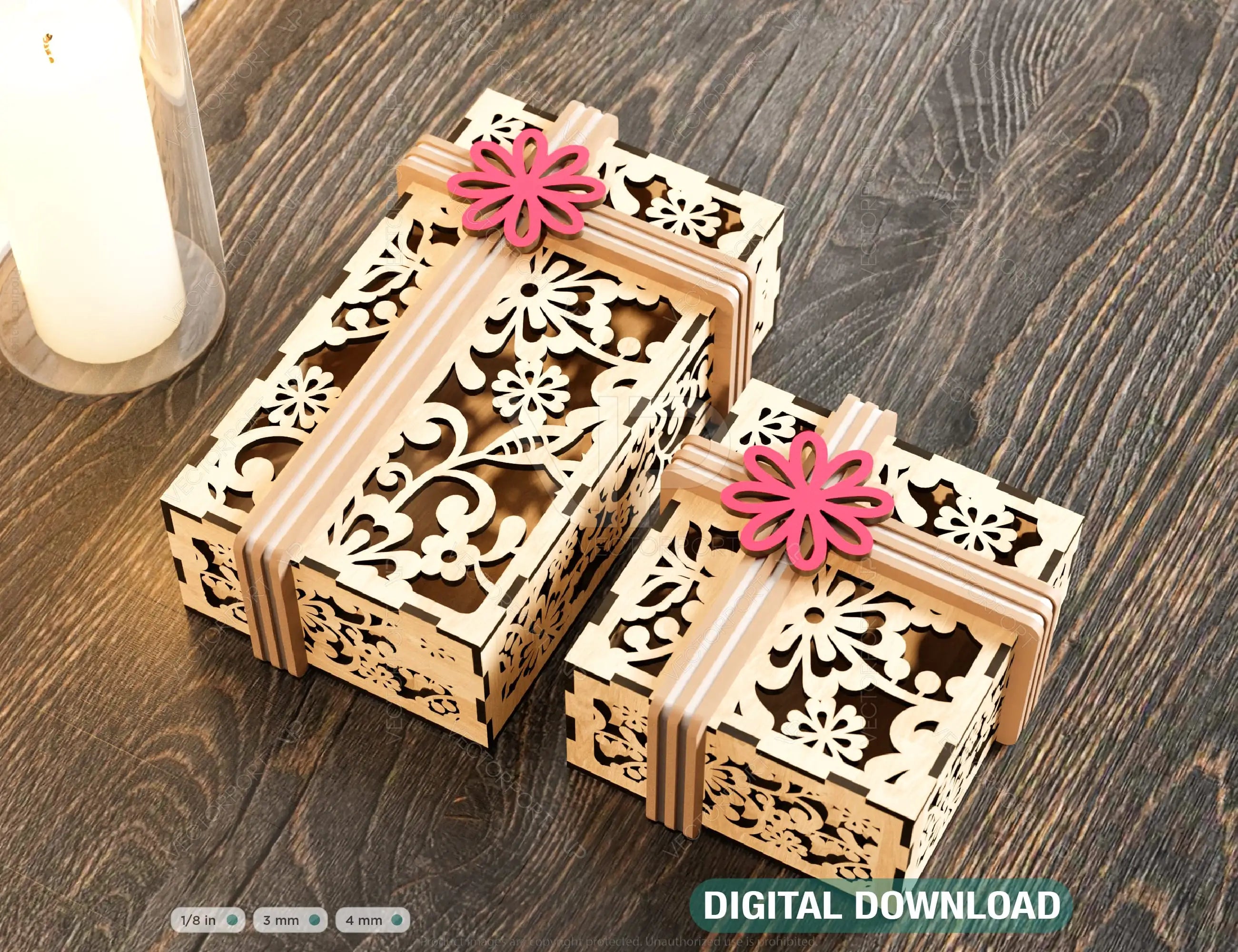 Gift Box Laser Cut with Ribbon Decorative Flowers pattern opener jeweler case Wedding Love vector Digital Download |#202|