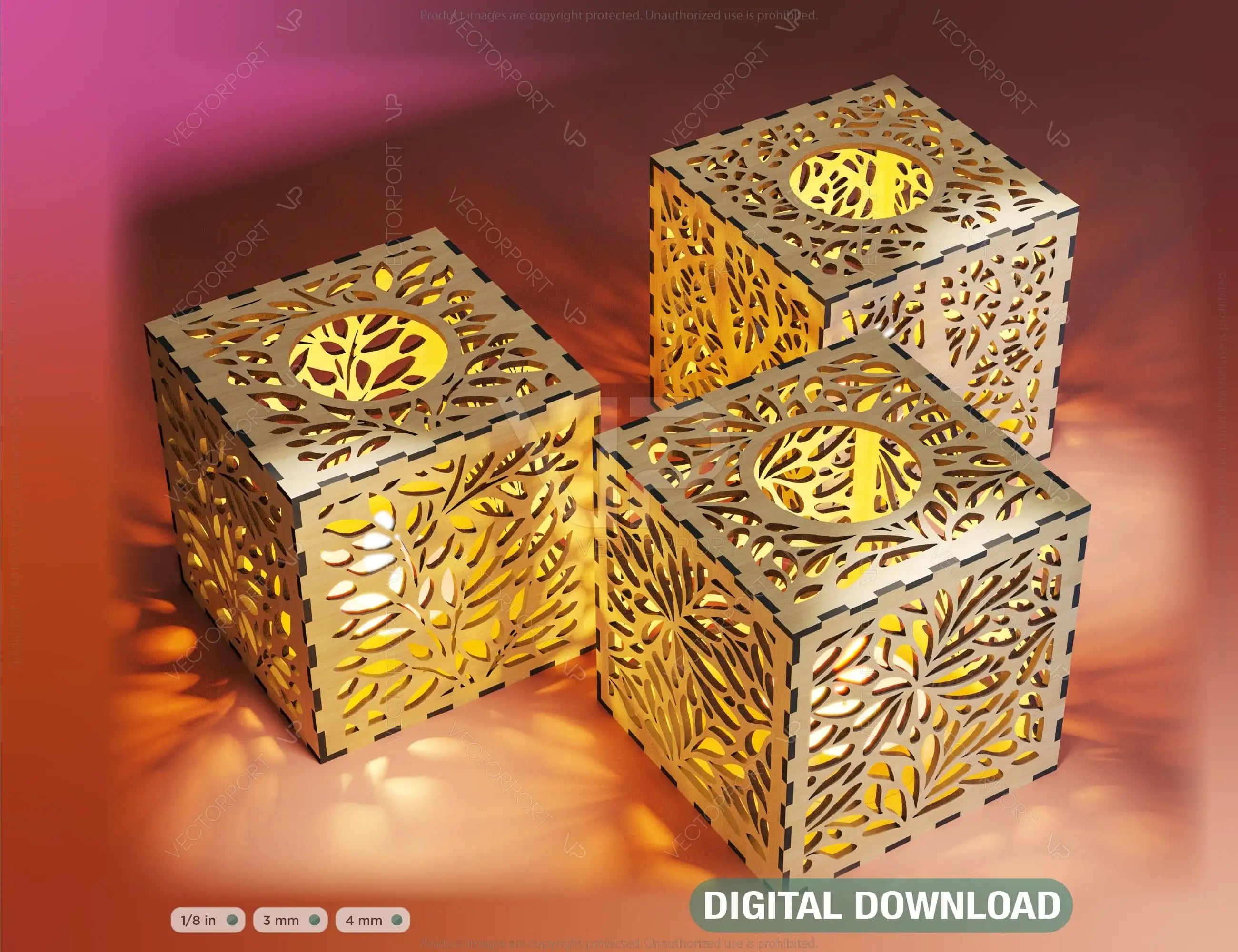 Tree Silhouette Leaves Wooden Candle Holder Laser Cut Lamp wood Tea light Lantern SVG |#U064|