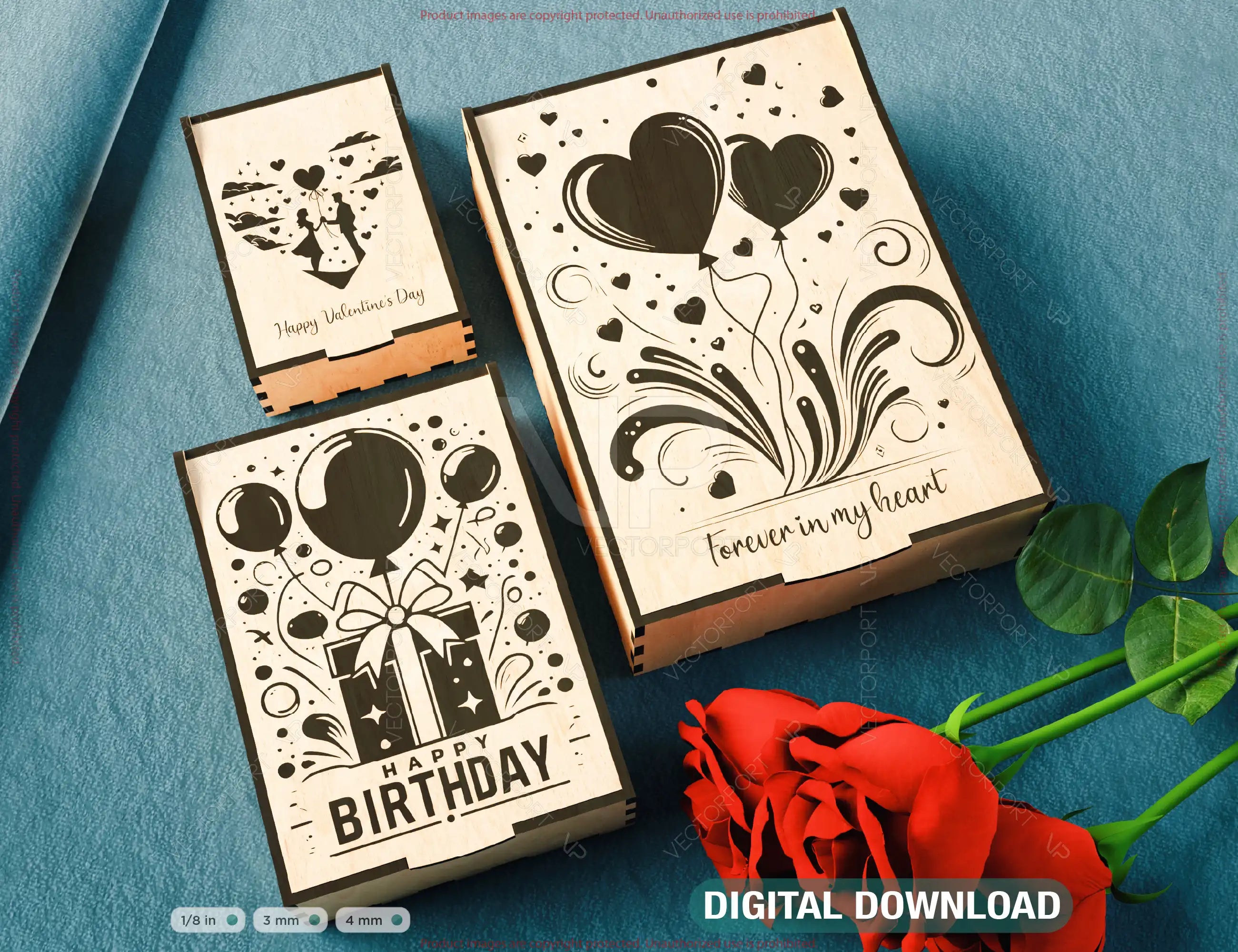 This digital download equips you with the files to laser-cut charming boxes in three sizes, perfect for storing keepsakes, cards, or small gifts for Valentine's Day, birthdays, and other special occasions.