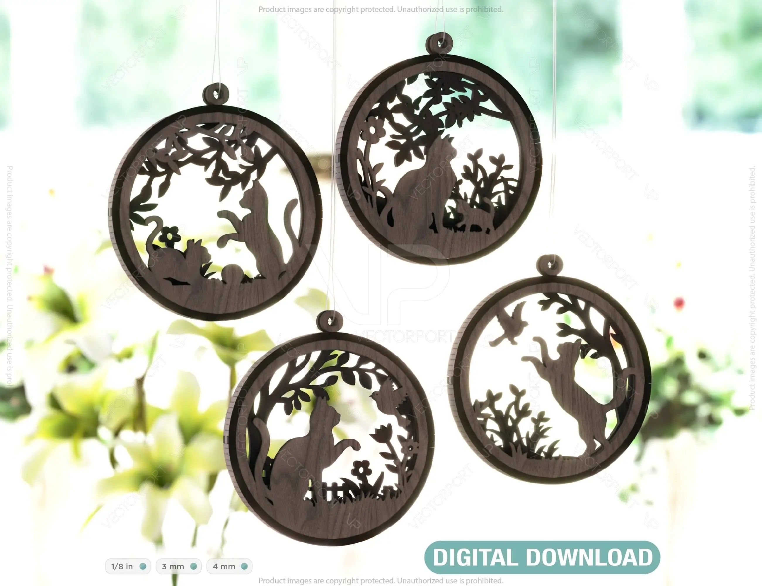 Celebrate the season with adorable feline friends! This digital download provides the files you need to create charming cat scene bauble ornaments featuring playful cats amidst a whimsical forest.