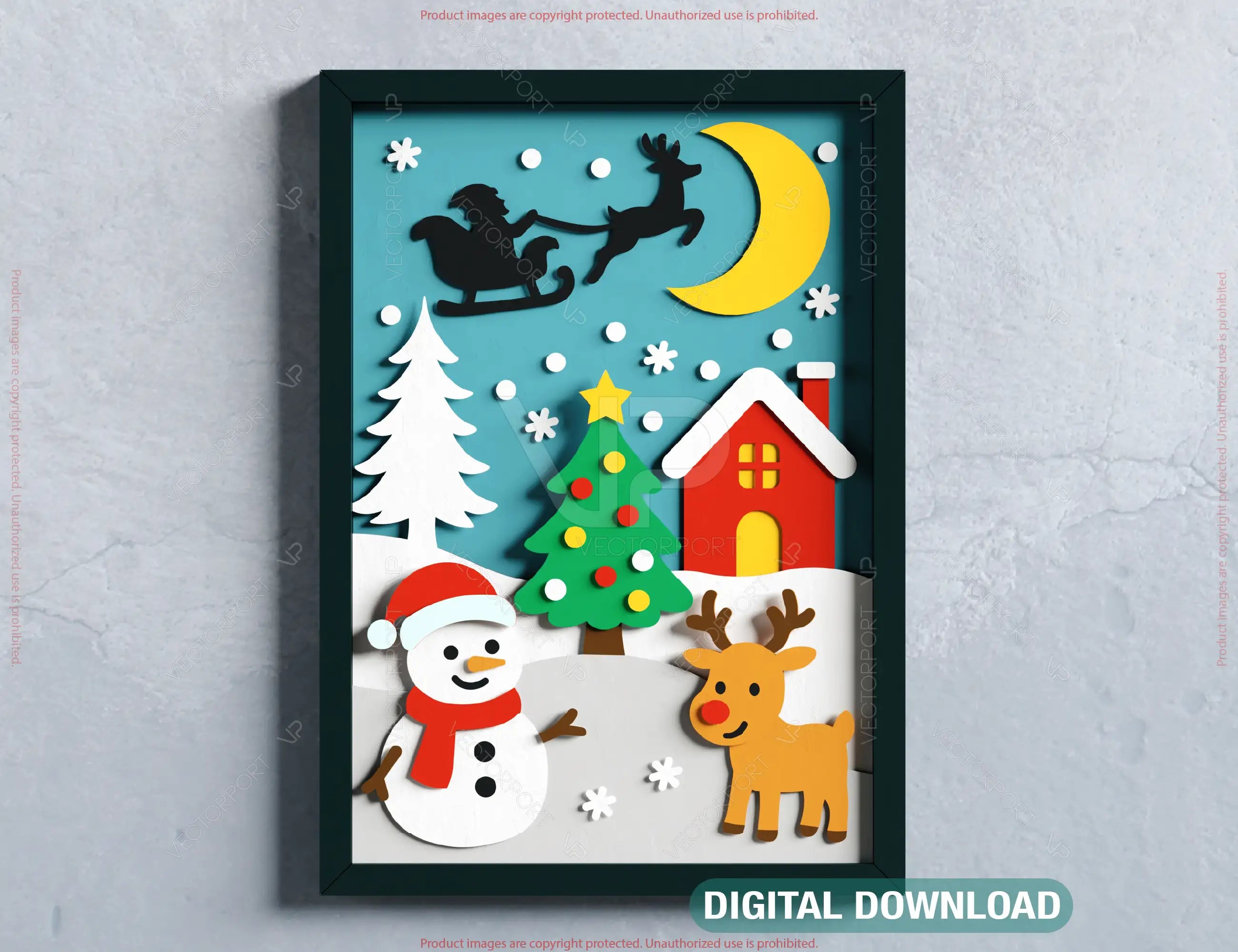 This digital SVG design features a cheerful snowman, reindeer, decorated Christmas tree, Santa’s sleigh, moon, and snowy house – all crafted in a layered paper cut style for stunning 3D depth.