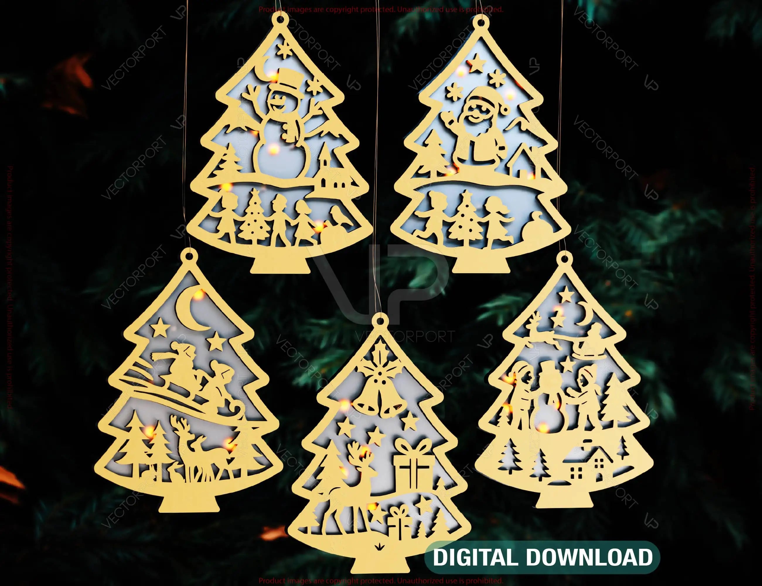 Christmas Tree Shape Ornament New Year Decoration | Laser Cut Snowy Scene Holiday Hanging Baubles | Digital Download |#255|
