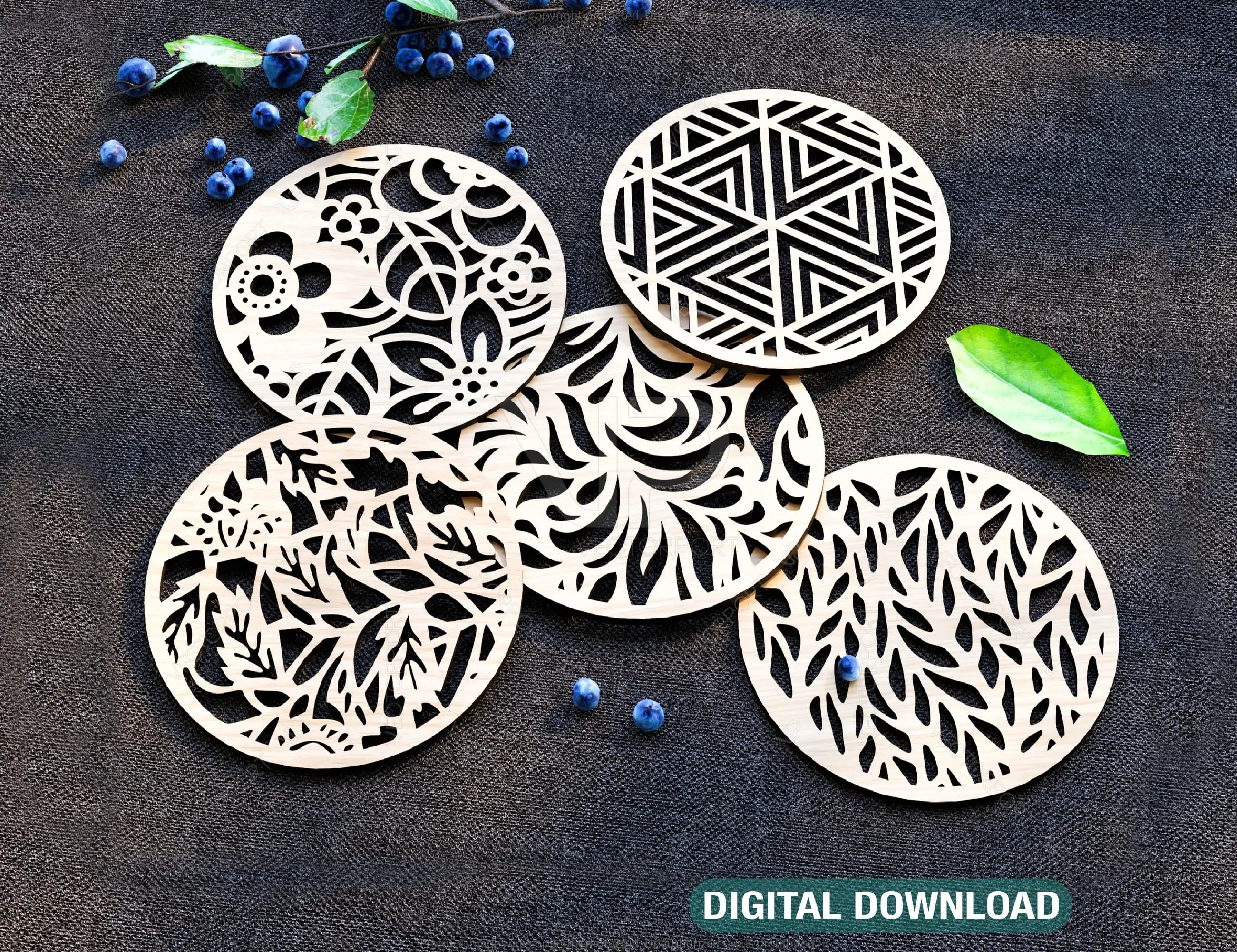 Elegant Round Laser Cut Wood Coasters Drink Tea Coffee Cup Mat Pad Placemat Tableware Digital Download | SVG, DXF |#177|
