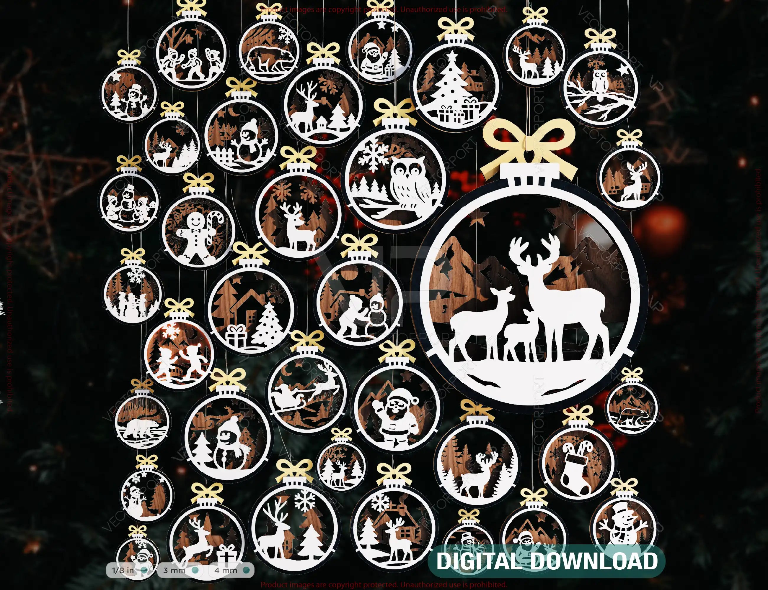 Perfect for crafters, hobbyists, and small businesses, this digital download set gives you a wide variety of festive, multilayer ornaments featuring snowy winter scenes, trees, and holiday baubles.