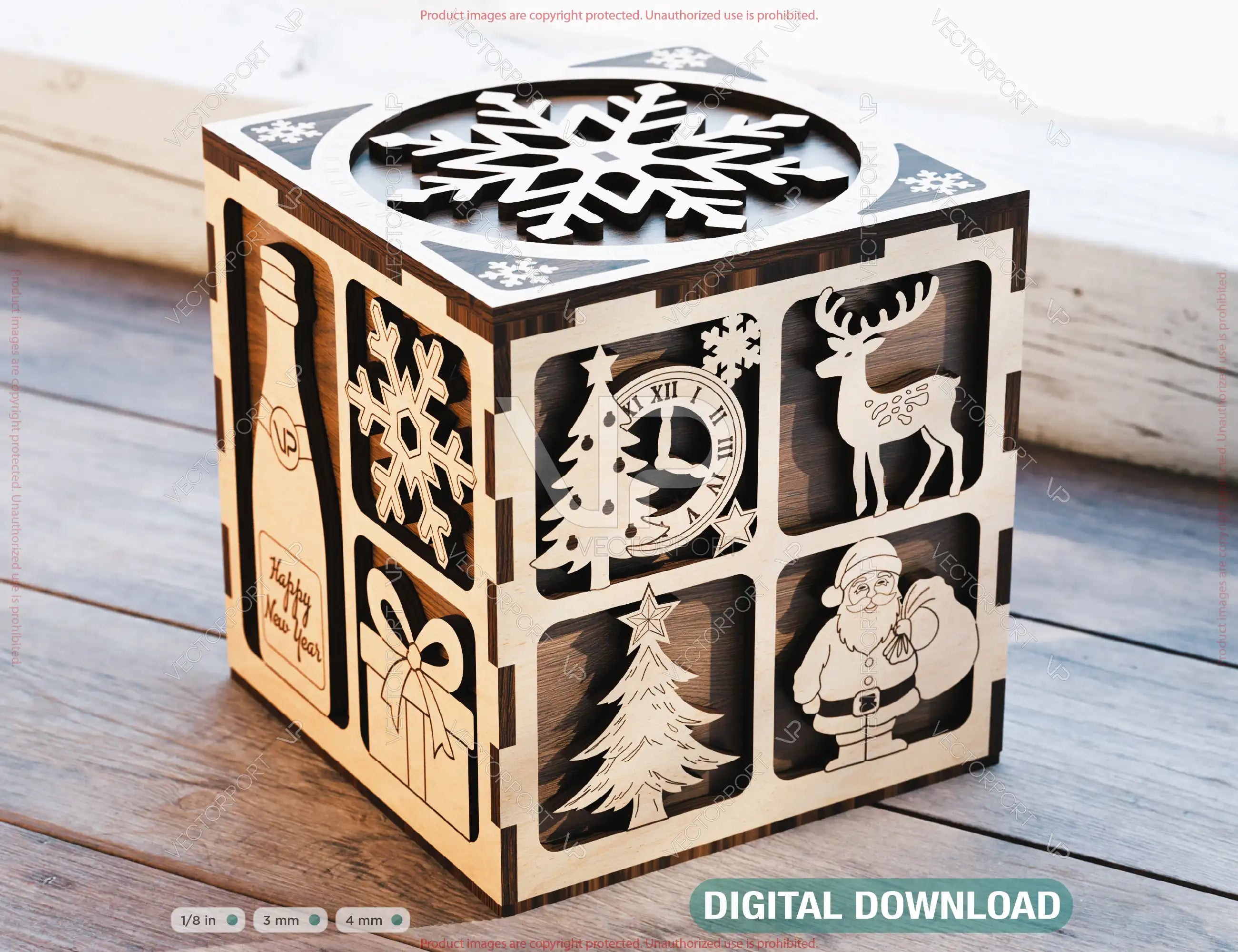 New Year Holiday Cube Gift Box – Laser Cut SVG File | Winter Ornaments | Christmas Digital Download |#U662|