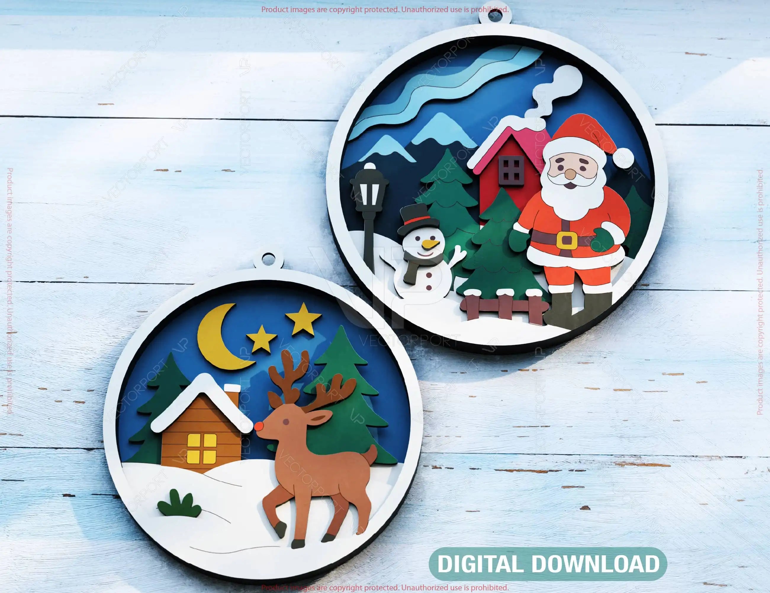 New Year Layered Design | Round 3D Winter Scene with Santa, Snowman SVG | Laser Cut Shadow Box Digital Download |#U600|