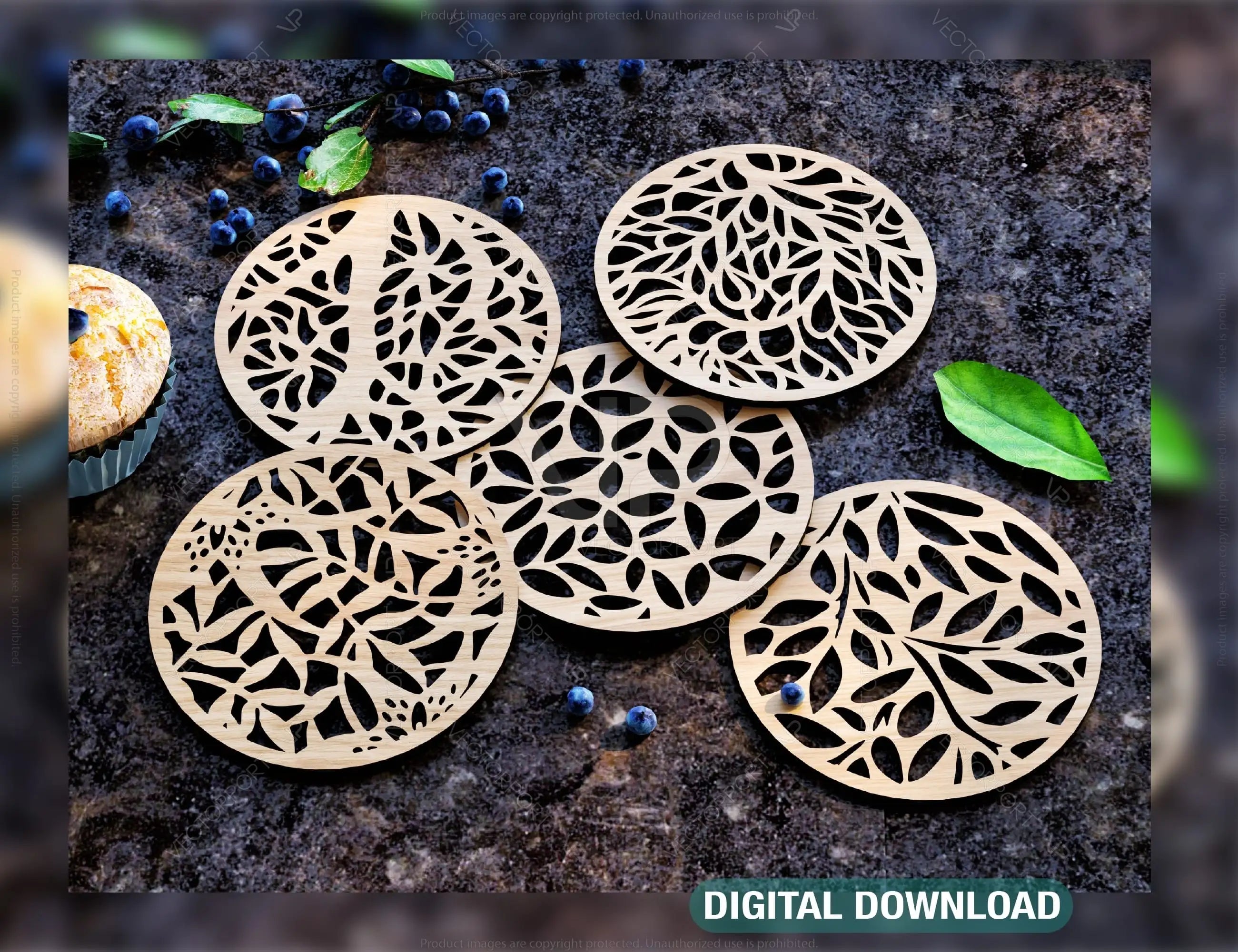 Round Laser Cut Wood Coasters Drink Tea Coffee Cup Mat Pad Placemat Tableware Digital Download | SVG, DXF |#U183|