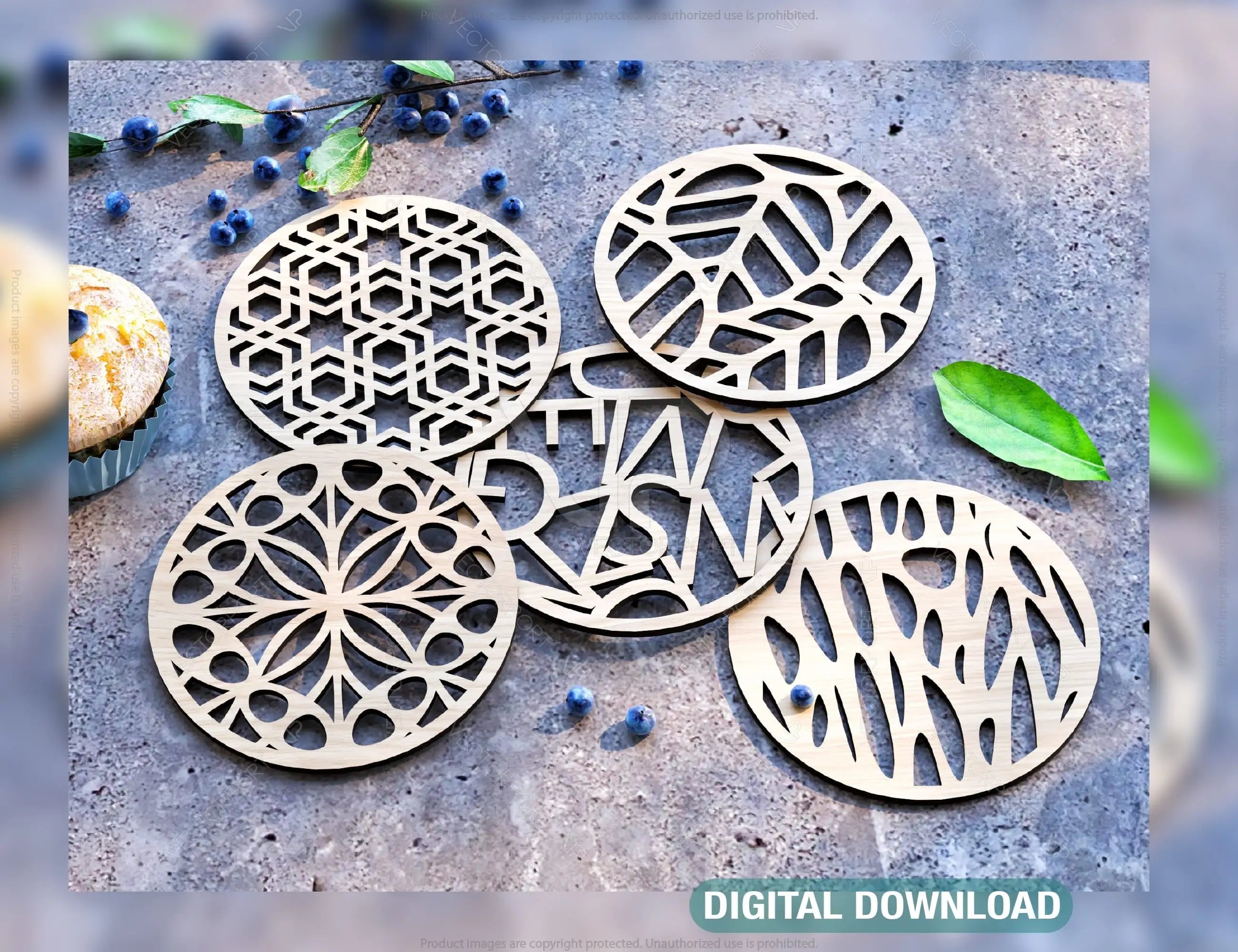Round Laser Cut Wood Coasters Drink Tea Coffee Cup Mat Pad Placemat Tableware Digital Download | SVG, DXF |#U185|