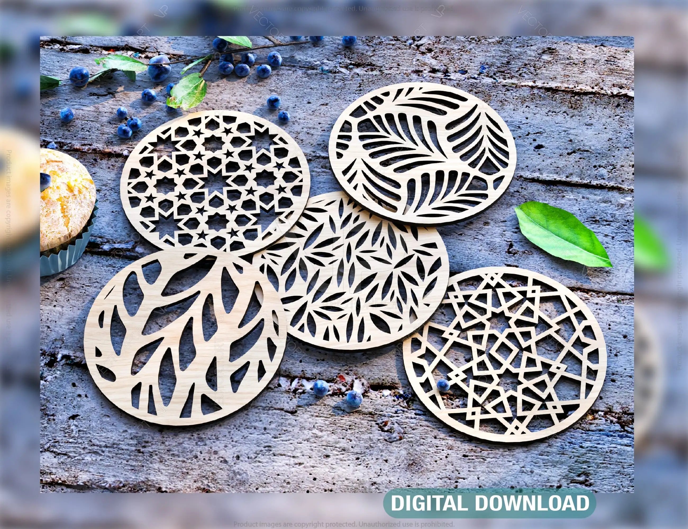 Round Laser Cut Wood Coasters Drink Tea Coffee Cup Mat Pad Placemat Tableware Digital Download | SVG, DXF |#U186|