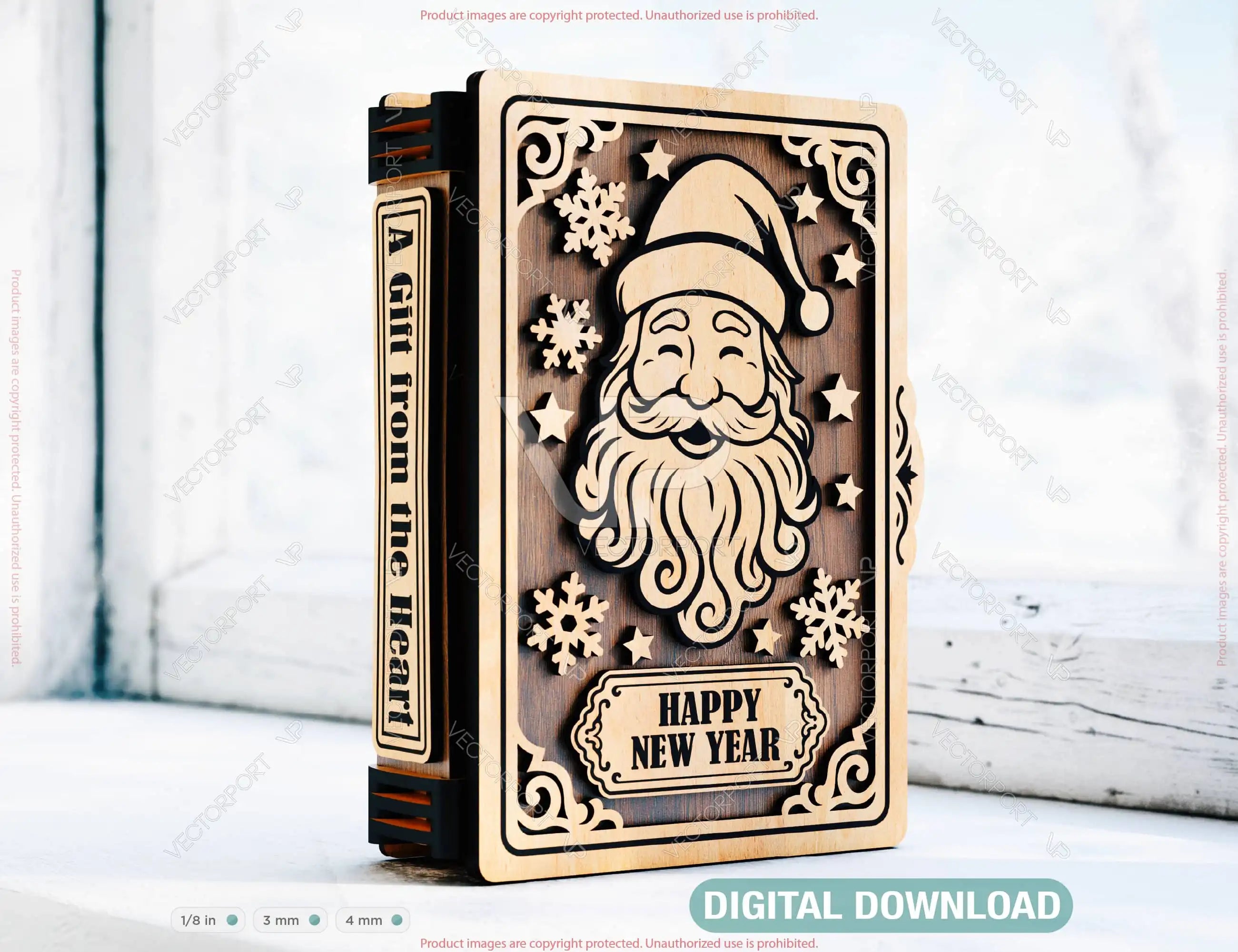 Bring cozy holiday charm to your crafts with this laser-cut wooden “book box” SVG design — perfect for storing small gifts, keepsakes, or festive decorations. Designed to look like a vintage book with intricate engraved details, it’s a beautiful way to add warmth and character to your Christmas décor.