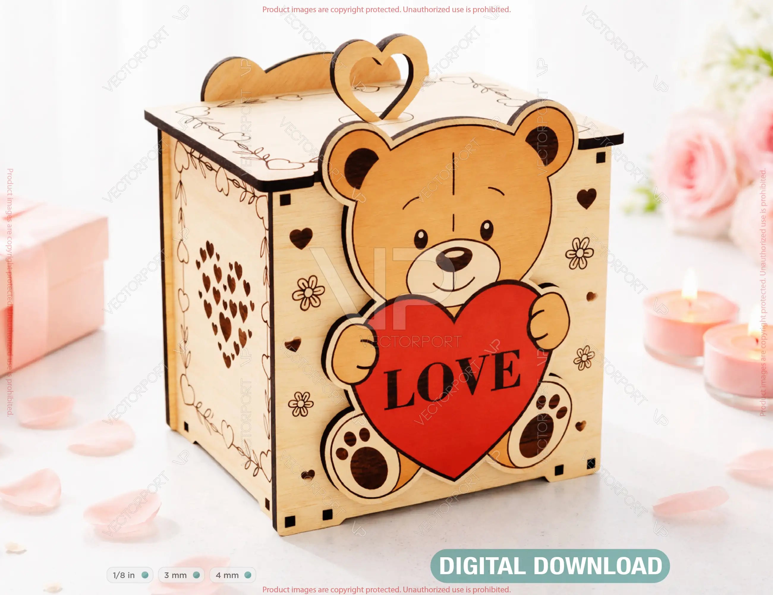 Teddy Bear Valentine Gift Box SVG | Laser Cut Wooden Love Box | Bear Heart Box Design | Digital Download |#U686|