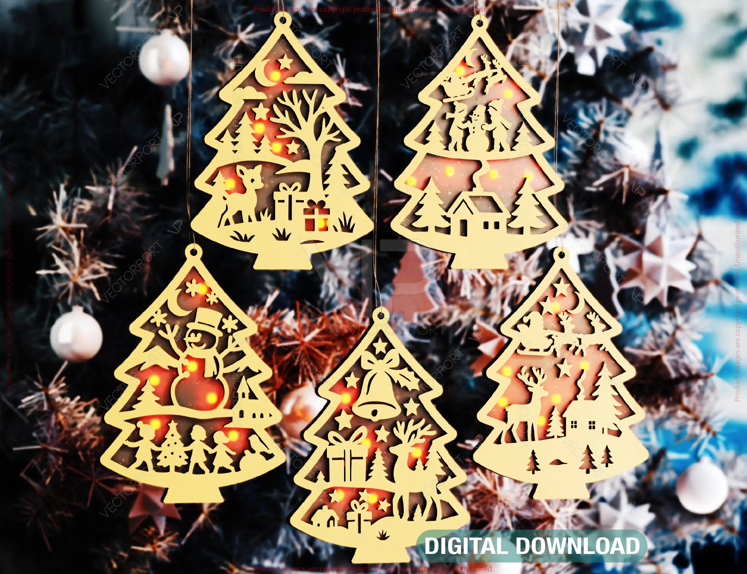 Tree Shape Christmas Ornament New Year Decoration | Laser Cut Snowy Scene Holiday Hanging Baubles | Digital Download |#U643|